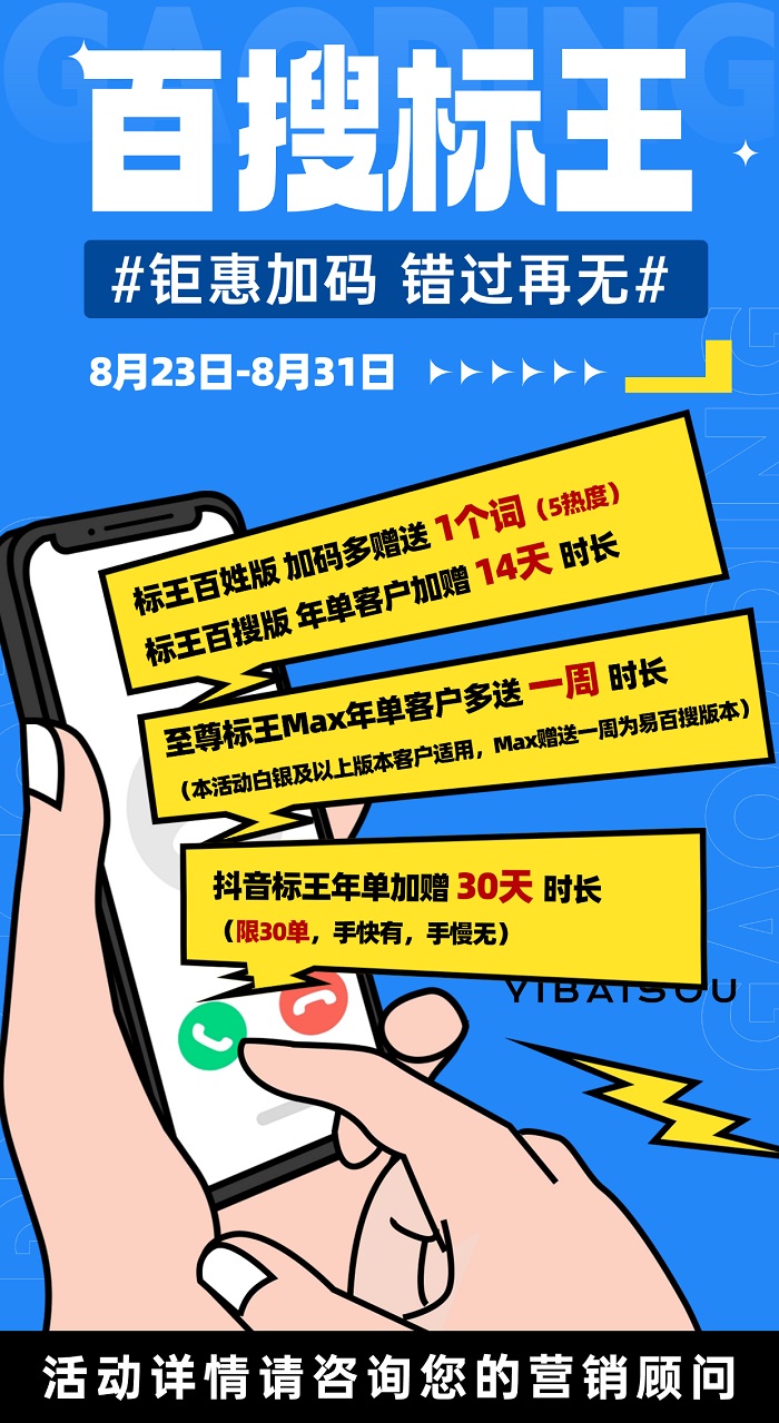 百搜标王8月加码活动划重点啦~发布时间:2024.08.23 新闻来源:镇江三鑫科技信息有限公司 浏览次数: